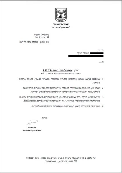בהמשך למכתב עמותת טבקה מיום 4.12.2025 לראשת המחלקה לחקירות שוטרים ולפרקליט המדינה, נמסר לנו לאחרונה מפרקליט המדינה כי פנייתנו הועברה לטיפולה של המחלקה לחקירות שוטרים בפרקליטות המדינה, אשר התבקשה לבחון את הדברים ולהשיב לנו במישרין בתום הבדיקה. בהמשך לכך עודכנו על ידי מח״ש כי בנוגע לאירוע המתואר נפתח תיק מח״ש.